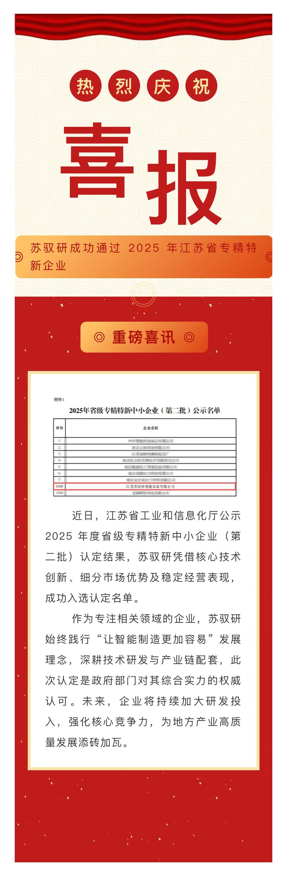 喜报丨苏驭研荣获2025年省级“专精特新”企业称号